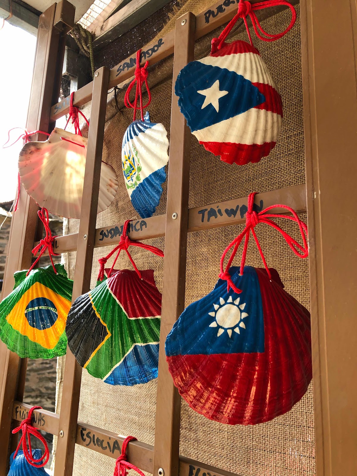 典故流傳下來,自然就有商機,原本吃完即丟的扇貝空殼,成了祈福的寄託,幾乎每位朝聖者都會買上一個喜歡的扇貝殼掛在背包上,當作保佑一路平安的護身符。有家KM33的小商店腦筋動得快,把各國國旗給畫上扇貝殼,在這種世界旅人川流交會的路上,頓時讓人愛國心起,直接買單,而且背上國旗走絕對不能漏氣,一定要給它走好走滿走到底,哈哈!