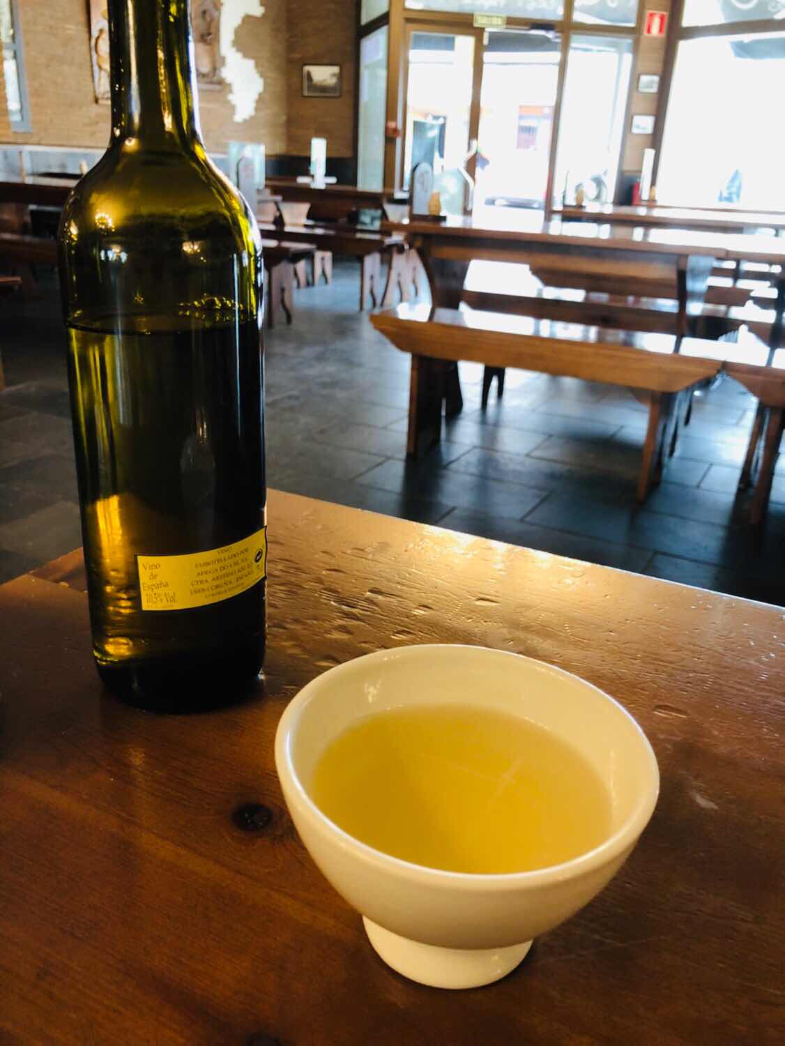 民宿老闆娘超熱情,好心幫我們訂好了Melide當地的特色餐廳,當我們已經拐著鐵腿撐到下榻厚,她說他兒子會帶我們去吃飯,不遠,就再走半公里而已⋯當場眼淚快流下來~ (好在很好吃,而且白酒用碗喝很特別)